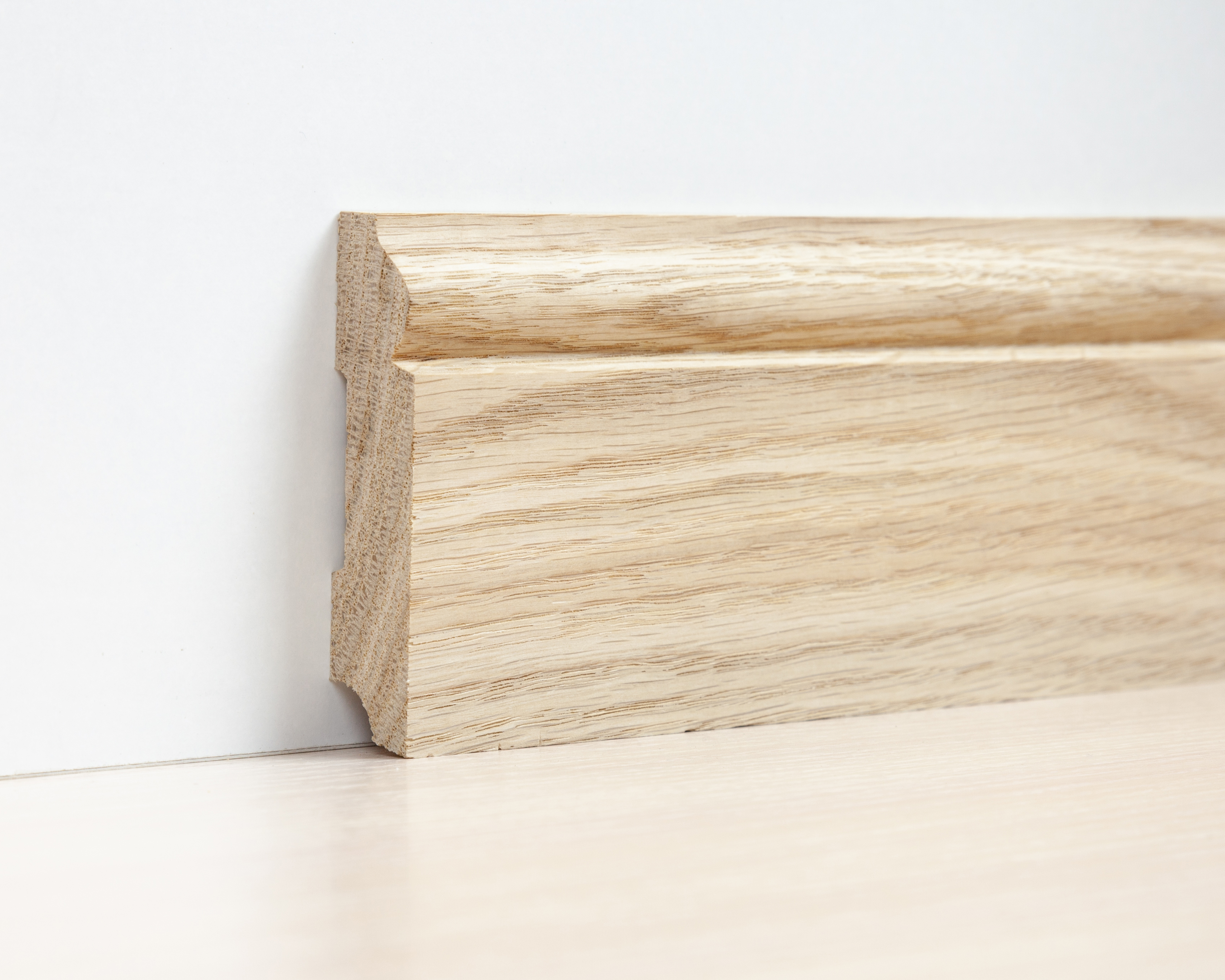 Универсальный дубовый плинтус формы Волна изготавливается из цельного массива дерева. После обработки дерева, выполнялась его камерная сушка под воздействием высоких температур. За счет этой процедуры влажность материала упала до 9-12 процентов.